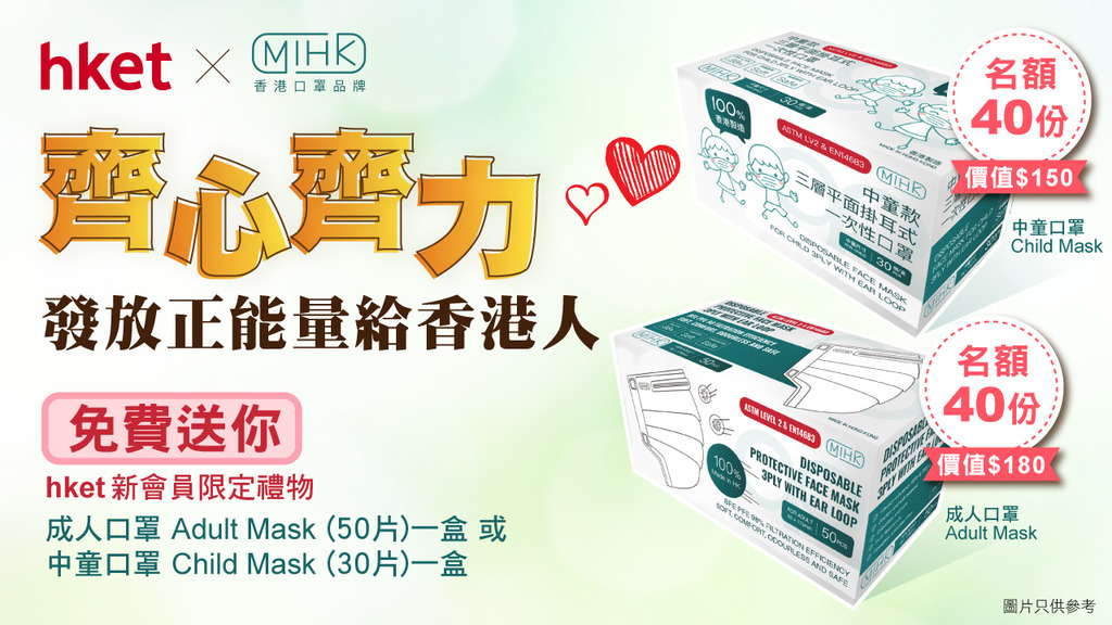 新會員限定!hket x MIHK香港口罩品牌 送 成人口罩 Adult Mask 50片 一盒,價值 $180 或 中童口罩 Child Mask 30片 一盒,價值$150!立即參加!香港人加油!齊心齊力 發放正能量給香港人!